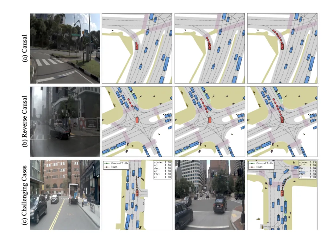 WAM-Diff 深入探索了因果序(Causal)、反因果序(Reverse-Causal)和随机序(Random)三种解码调度策略。实验结果揭示了一个反直觉但极具价值的现象:反因果序策略在闭环指标上表现最佳。这意味着,先确定远处的终点状态,再倒推近处的轨迹细节,这种「以终为始」的生成逻辑能显著提升规划的一致性与安全性。这一发现从模型层面验证了人类驾驶员在复杂博弈场景下的直觉思维。