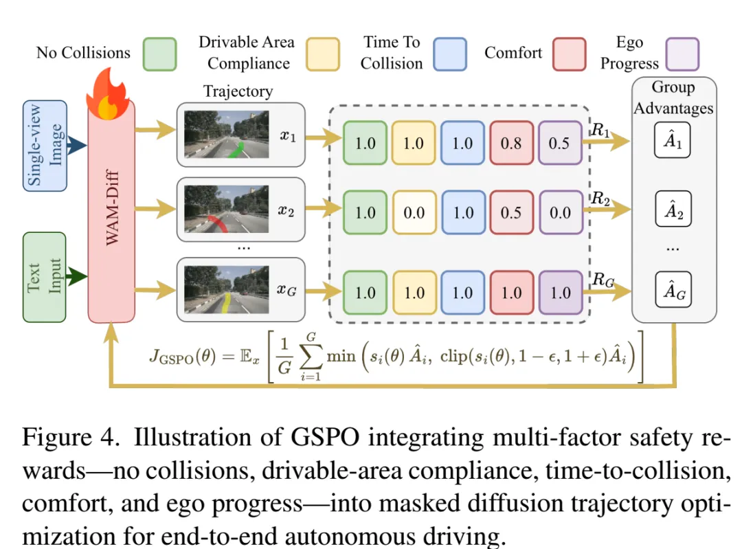 WAM-Diff 引入了分组序列策略优化(GSPO, Group Sequence Policy Optimization)算法,旨在弥合开环训练与闭环执行之间的鸿沟。GSPO 的核心思想是将优化粒度从「单步 Token」提升至「完整轨迹序列」。系统在仿真环境中采样一组候选轨迹,并依据NAVSIM的成绩得分作为强化学习的奖励,包括了安全性(碰撞检测)、合规性(车道保持)及舒适性(加减速平滑度)。通过计算组内相对优势,模型被显式引导向「高安全、高舒适」的区域更新。这种序列级的价值对齐机制,从根本上确保了规划结果不仅「像人」,而且比人类驾驶数据更安全、更规范。