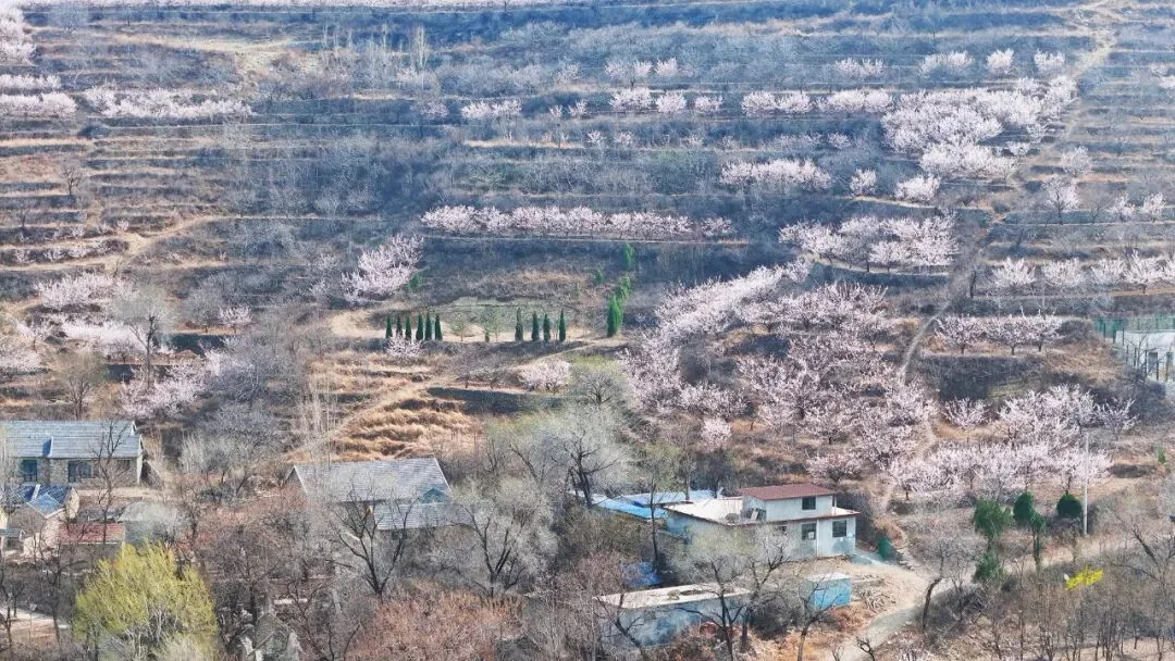 石匣村杏树种植在层叠的山坡梯田间,远看也很壮观,感觉算是济南地区规模偏大的杏花林了,远远望去一整个山谷都萦绕着粉白的杏花。