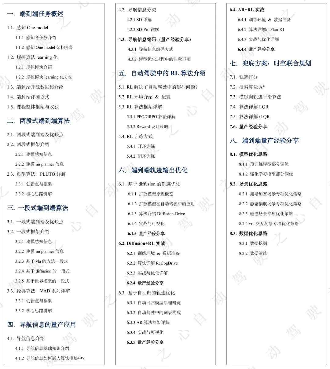 这两个月很多公司算法负责人联系自动驾驶之心,迫切的想要了解端到端需要哪些技术能力。为此我们联合工业界大佬开展了这门《面向端到端量产的实践小班课》!课程只有一个重点:聚焦量产。从一段式、两段式、强化学习、导航应用、轨迹优化、兜底方案再到具体量产经验分享。面向就业直击落地,所以这门课程目前不打算大规模招生,课程名额仅剩「5名」...