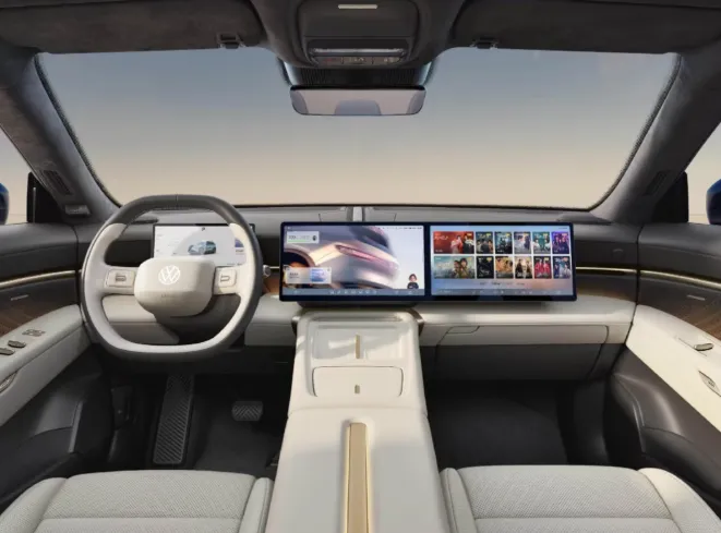 内饰同样是“新势力味道”。双大屏连在一起,尺寸接近15英寸级别,再加上一些金属装饰和氛围设计,整体质感明显比传统大众更年轻。像副驾零重力座椅、超大尺寸全景天窗这些配置,也是在往舒适性拉满。