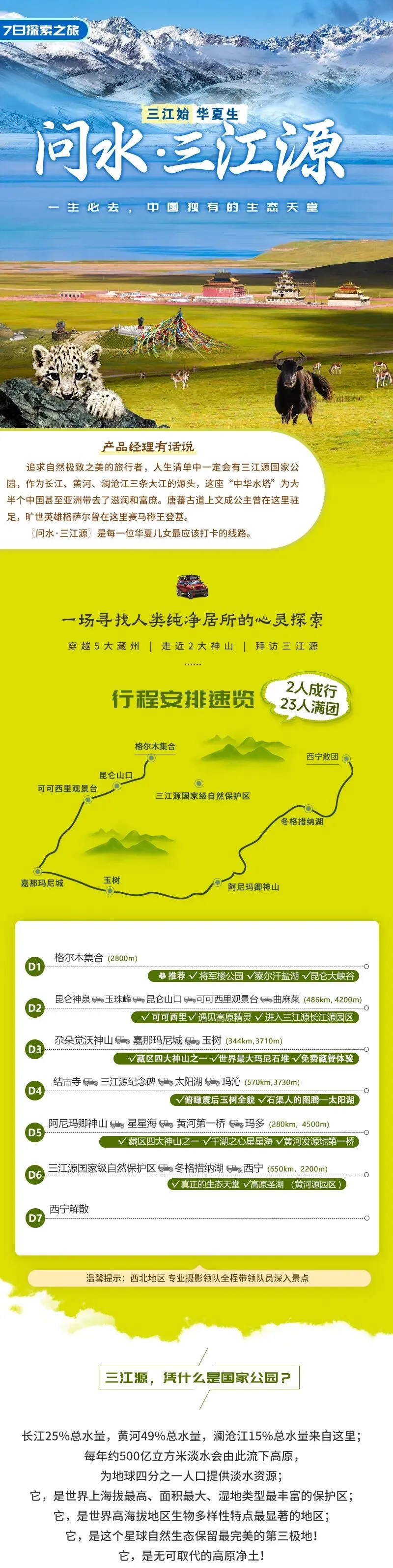 2.由于我们进入的是三江源国家公园黄河源,请小伙伴们务必保证绿色环保,带走自己所产生的一切生活垃圾,如有能力也请在游玩的同时捡走其他垃圾,为我们共同守护的三江源贡献一份力量;