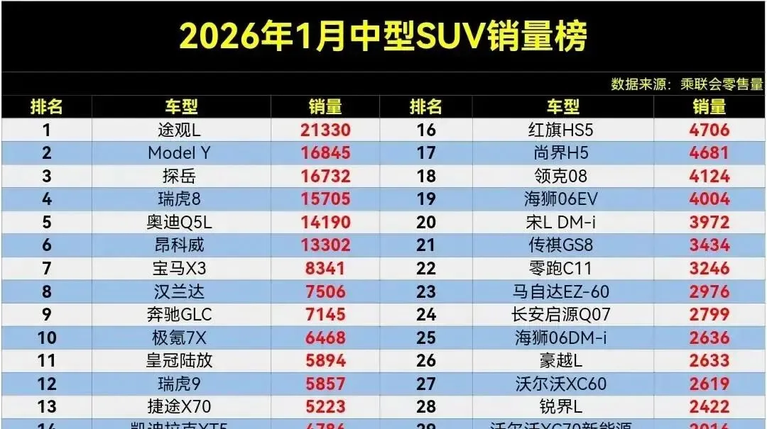 先甩数据:1月中型SUV销量榜,途观L狂卖2.1万辆,特斯拉ModelY只剩1.6万,探岳和瑞虎8都超1.3万。汉兰达稳在第八,7000多辆,但比亚迪唐?35名开外,比去年掉了一大截。更扎心的是,新能源车集体失血:ModelY、海狮06EV、领克08全在4000辆出头,而奥迪Q5L、昂科威这些老油条反而稳如老狗。数据不会骗人,2026年1月,传统燃油车正杀得新能源车片甲不留。