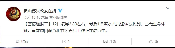 12日10时许,黟县公安局发布警情通报二:12日凌晨2:30左右,最后1名落水人员遗体被找到,已无生命体征。事故原因调查和有关善后工作正在进行中。