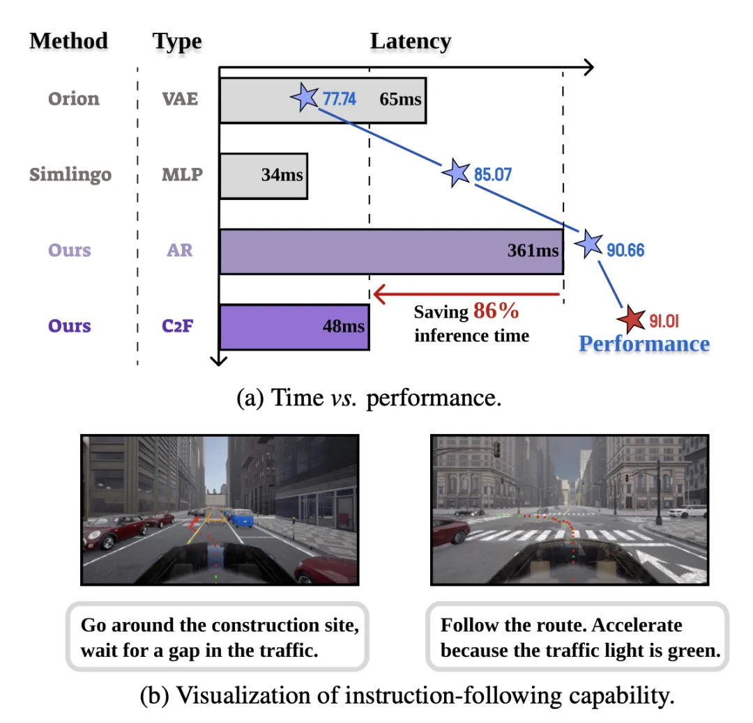 如图所示:LinkVLA 不仅大幅降低推理延迟,而且在指令跟踪准确性和驾驶性能方面也取得持续的提升。