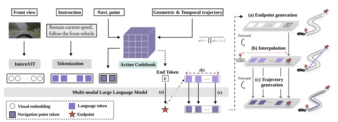 统一token空间。该方法基于一个统一的语言和动作token空间。首先对连续轨迹进行量化来实现这一点:局部鸟瞰图(BEV)空间被划分成一个由 K_action 单元格组成的网格,每个单元格定义一个唯一的动作token。轨迹 T = {w_1,...,w_T} 通过将每个路径点映射到其对应的单元格,转换为动作token序列 A = {a_1,...,a_T}。然后,将此动作码本(C_action)与模型的文本词汇表(大小为 K_text)合并,形成一个大小为 K = K_text + K_action 的统一码本 C。动作token嵌入以端到端的方式学习,迫使模型将语言和空间概念映射到共享表示中,从而使单个 VLM 模型能够同时处理两者。在推理过程中,每个预测的动作token只需解码回其对应网格单元格的中心即可。