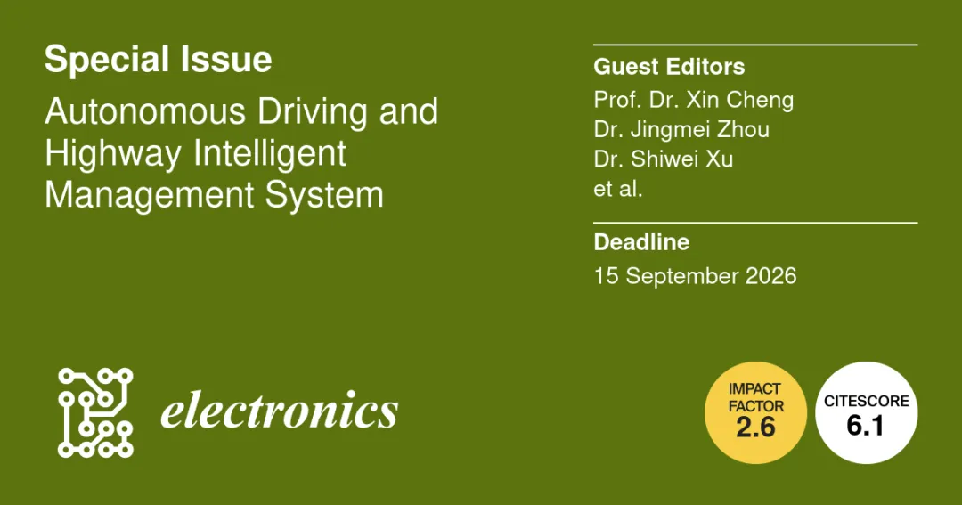 Electronics 邀请了程鑫教授、周经美副教授、许世维副教授和杨洋副教授,合作创建特刊“Autonomous Driving and Highway Intelligent Management System (自动驾驶与高速公路智能管理系统)”。本特刊将探讨自动驾驶及智慧高速基础设施相关的创新解决方案和前沿研究。研究主题涵盖车路协同与智慧高速的各个方面,包括复杂环境车辆精准感知、车辆高精度定位与构图技术、智慧高速公路系统以及自动驾驶测试与评估技术等。