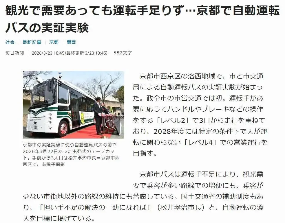 《每日新闻》23日报道,受司机短缺问题困扰,京都市巴士公司既难以在旅游需求旺盛、乘客众多的线路增加班次,也难以维持市中心以外乘客较少的线路运营。在国土交通省补贴制度的支持下,京都市长松井孝治表示“希望能以此助力解决人手短缺问题”,并提出了引入自动驾驶技术的目标。