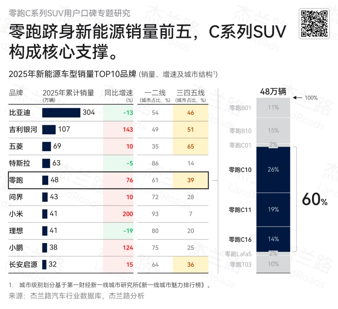 2025年,零跑汽车国内销量达48万辆,同比增长76%,成功跻身新能源市场销量TOP5阵营;在新势力品牌中,仅次于特斯拉,成为年度最具增长势能的代表性品牌之一。从城市层级分布来看,不同于多数新创品牌高度集中于一二线城市的格局,零跑的销量结构呈现出更明显的下沉特征,其城市布局与以比亚迪、吉利银河为代表的主流自主品牌更为接近,体现出更广泛的大众市场渗透能力。