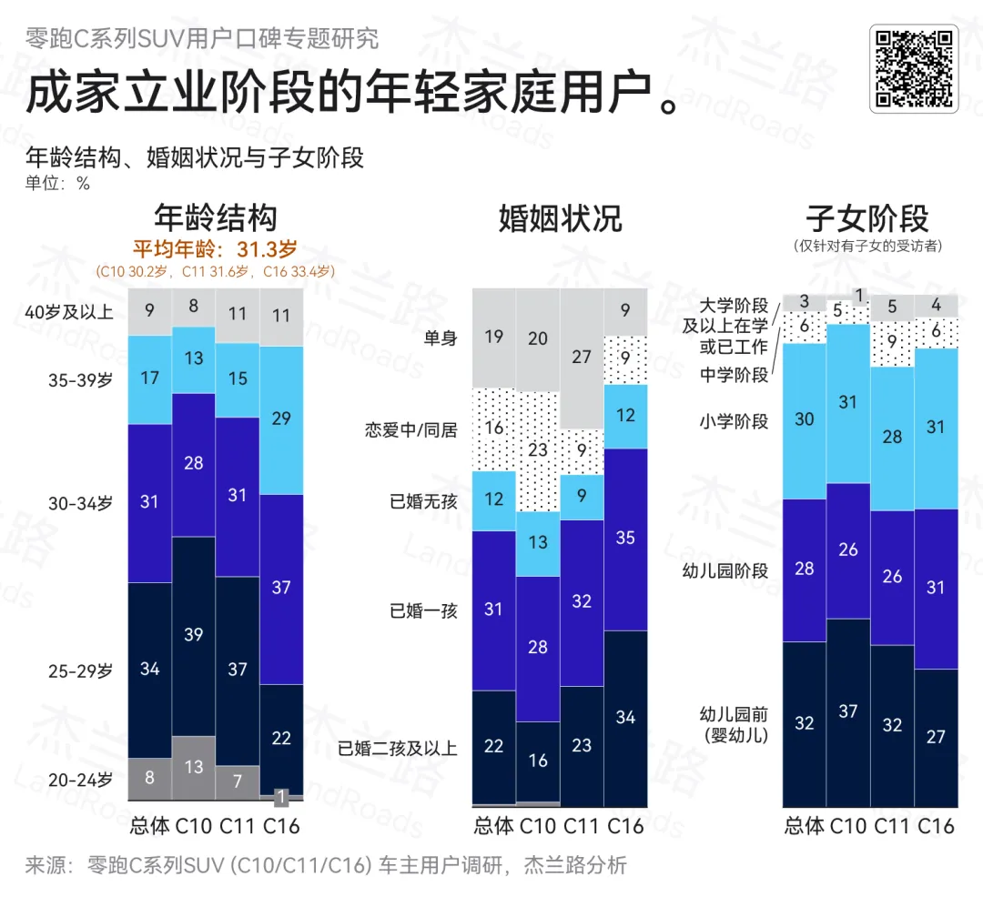 成家立业、进入育儿阶段的中青年群体,是零跑C系列SUV的核心用户基础。整体来看,车主平均年龄为31.3岁,略低于行业平均水平,其中65%集中在25–34岁区间,呈现出明显的年轻化特征。从家庭结构来看,64%的车主已婚,且53%已育有子女,用户整体处于“成家立业-育儿初期”的关键人生阶段,购车需求更偏向家庭导向与实用价值。