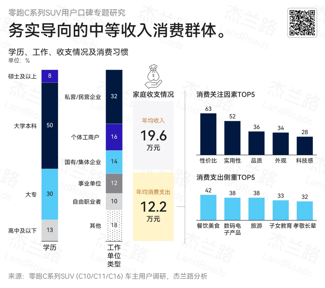 零跑C系列SUV车主整体呈现出中等收入水平下的务实型消费特征。从人群结构来看,本科及以上学历占比过半,就业以私营/民营企业为主(32%),具备一定教育背景与稳定职业基础。从收支情况来看,家庭年均收入为19.6万元,年均支出12.2万元,整体处于大众消费群体的中间水平,消费能力与支出结构相对均衡。