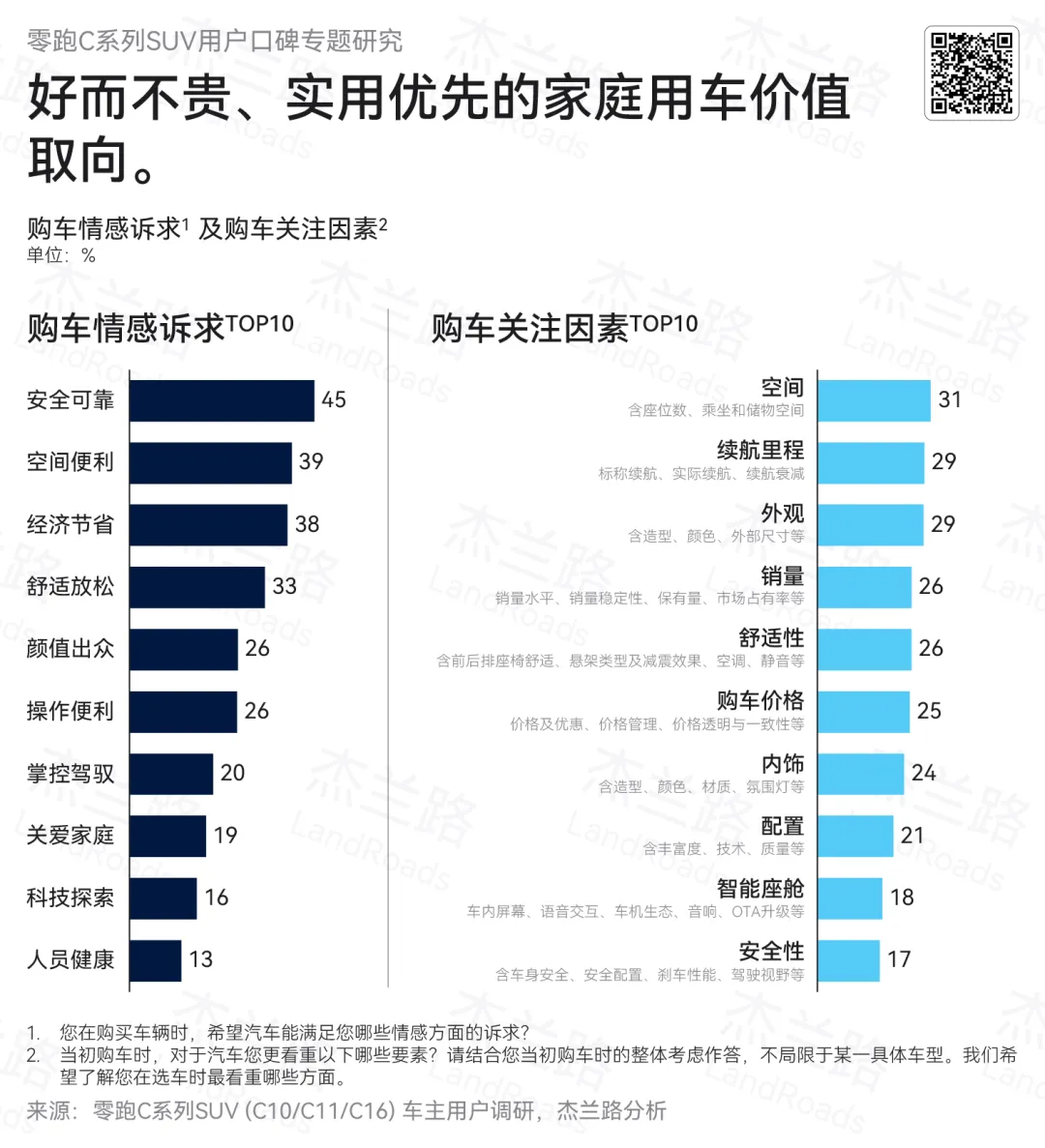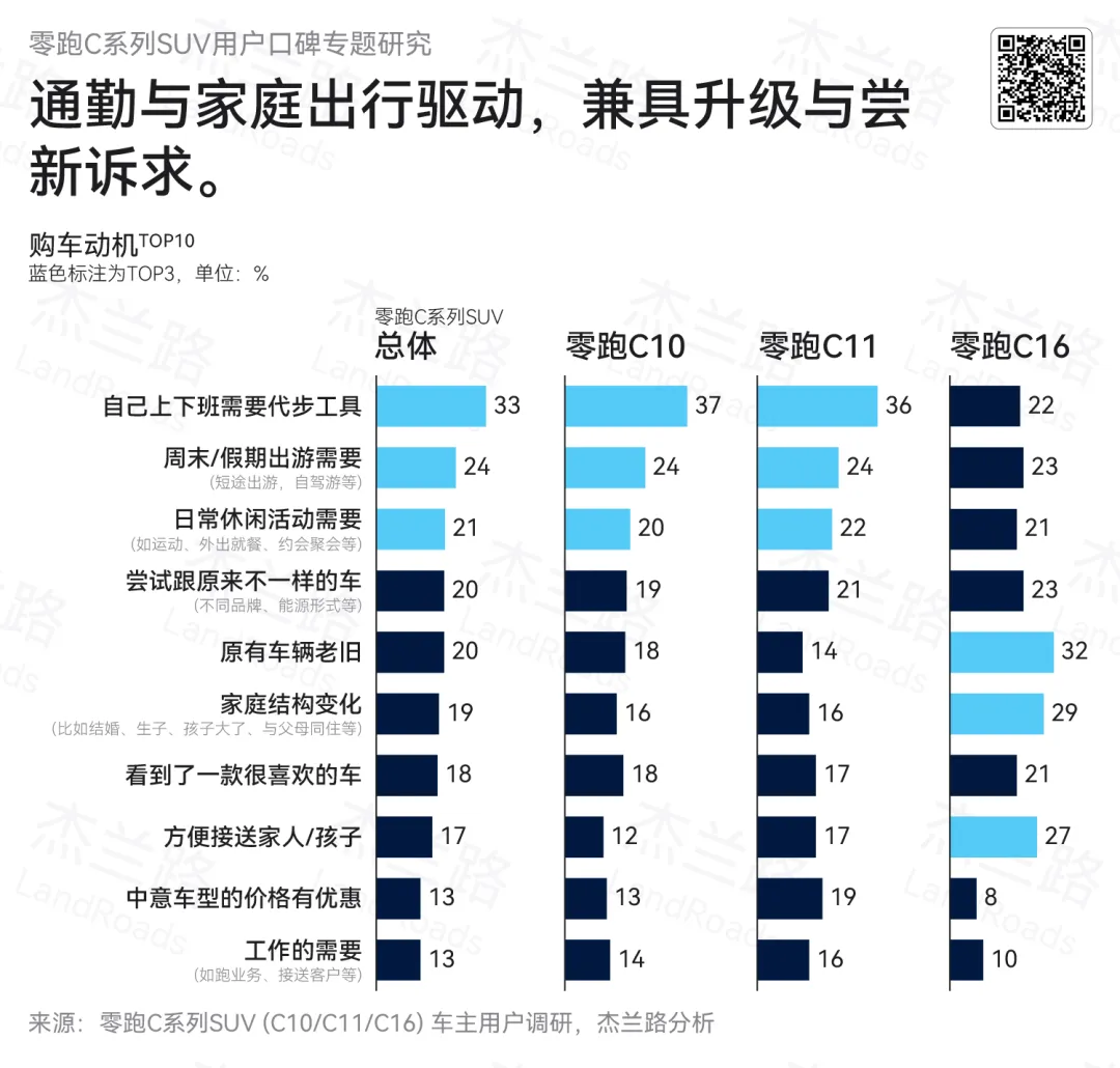 进一步拆解其销量结构可以发现,C系列SUV车型贡献了约六成的销量份额,是支撑品牌规模增长的核心车系。基于这一结构特征,杰兰路近期围绕零跑C系列SUV用户开展了专项研究,旨在从用户视角出发,系统解析其销量快速攀升背后,产品供给与用户需求之间的适配逻辑。