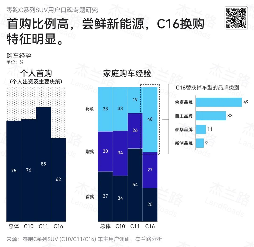 从家庭购车经验来看,零跑C系列SUV整体仍以首购家庭居多,占比37%;但这一结构在不同车型之间存在明显差异。C11的家庭首购特征最突出,首购占比达54%;C10相对均衡,首购与增购占比较为接近;而C16则以家庭换购为主,换购占比高达49%,显著高于首购(25%)和增购(27%),说明其更强地承接了家庭用车升级需求。