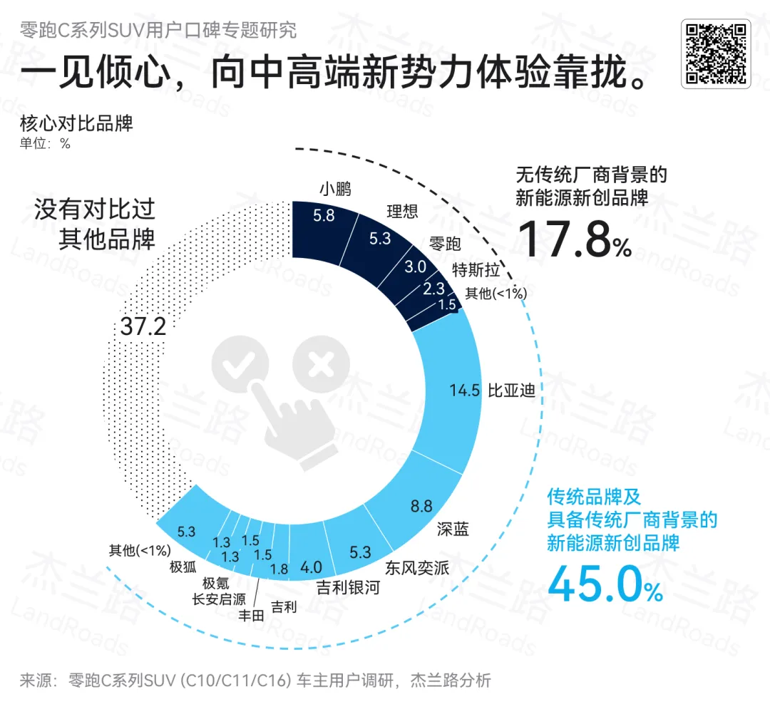 在购车决策的车型对比阶段,37.2%的用户在购车时未进行对比,直接选择零跑,体现出其在目标人群中的一定直观吸引力;另一方面,其余用户则普遍进入对比决策环节,具体来看,45.0%的用户主要对比传统品牌及有传统厂商背景的新能源新创品牌,其中以比亚迪、深蓝、东风奕派、吉利银河为代表,这一类品牌在价格区间与产品定位上更接近零跑,是其最直接的竞争对手。