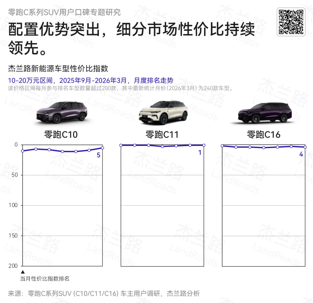 杰兰路2025年9月正式推出产品配置丰富度与性价比指数体系。自首期榜单发布以来,零跑C系列持续位列10–20万元价格区间性价比指数前列,其中C11与C16更是稳定进入TOP5,体现出其在主流价格带中的稳定竞争优势。从产品力结构来看,对比同价位SUV车型,零跑C系列在智能化配置、外部配置、内饰配置以及车机与娱乐系统等多个维度均具备较为明显的配置领先优势。