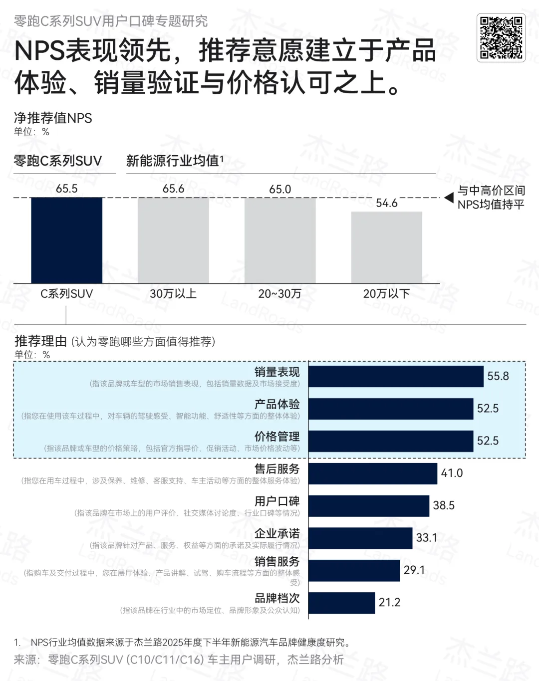 本次调研显示,零跑C系列SUV整体NPS为65.5,高于新能源行业平均水平(59.1),并与30万元以上价格区间车型(65.6)基本持平,体现出其在主流价格带中的口碑表现已具备跨价格带竞争力。