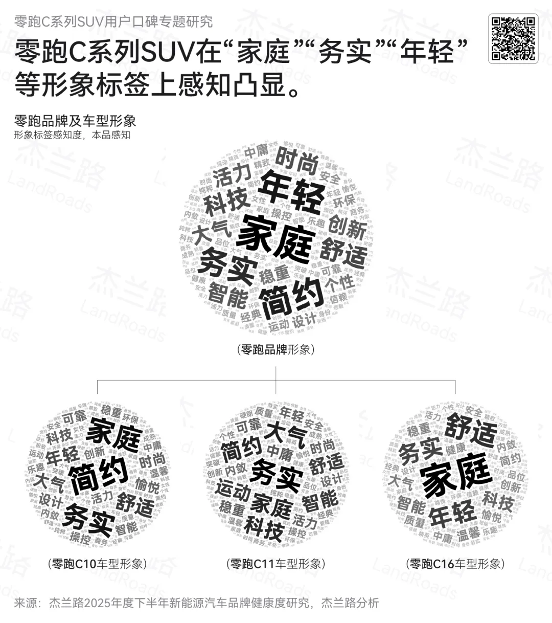 从形象感知来看,零跑C系列SUV在“家庭”“务实”“年轻”等形象标签上具备显著优势,用户感知与产品定位高度一致,体现出较强的市场适配能力。与此同时,其在主流价格带中实现了接近中高端新势力的产品体验,并通过稳定的价格体系与持续增长的销量表现,建立起用户对品牌的信任基础。