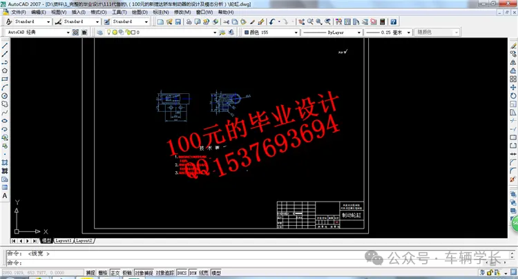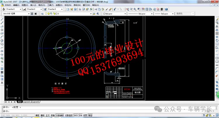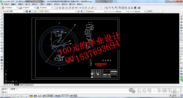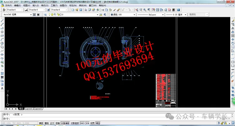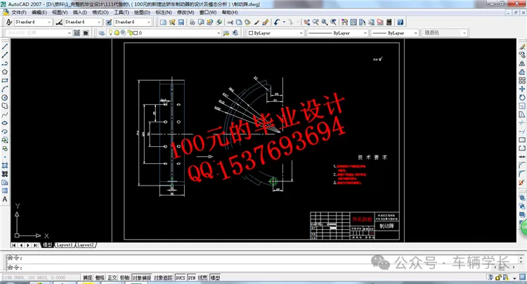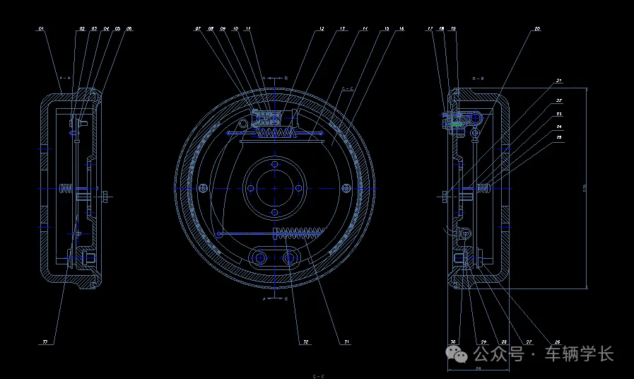 CAD 图纸的核心要素包括制动盘尺寸链、模态分析标注、技术要求说明三类。前制动盘图纸需标注端面圆跳动公差(≤0.05mm)与通风道宽度(8-10mm),保证制动平顺性;后制动鼓图纸需标注内径公差(±0.1mm)与圆度公差(≤0.05mm);技术要求需包含制动器的制动距离(100km/h 制动距离≤40m)、热衰退率(≤15%),同时添加模态分析要求,制动盘一阶固有频率≥120Hz;制动管路图纸需标注管路直径(Φ8mm)与弯曲半径(≥30mm),保证液压油的顺畅流动。