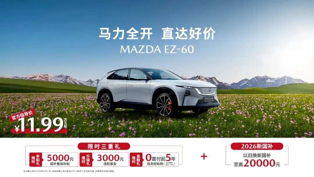 质价比如此突出,现在入手更是恰逢其时。即日起至3月31日,购买EZ-60品牌准备了三重限时好礼:不仅有国补基础上的厂家5000元额外补贴,还有3000元选配基金可以直接抵扣;想减轻压力的话,0首付加5年超长低息也安排上了,年均费率低至1.99%,几乎没什么负担。