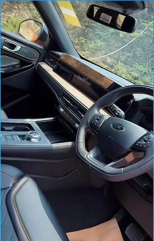 进到车里,这价位的车探险者做得还算用心,中控上软性材料多,用手摸着还不错,不像有些车那种硬邦邦的廉价塑料。方向盘厚度和握感都挺好,皮质偏厚实,不滑手也不油腻。12.8寸的中控屏不算大,但够用,福特这几年在车机流畅度上确实进步不少,不卡顿了不少,开车体验有提升。座椅支撑还不错,腰靠可以调,坐垫长度足够对大腿照顾到位,就是包裹性稍微差点,不那么紧致,开弯时人会有一点晃动感,没那么稳,但日常家用也凑合。储物空间设计挺实用,中控下面大格子和门板储物槽容量都够,瓶装水手机这些放着都方便。