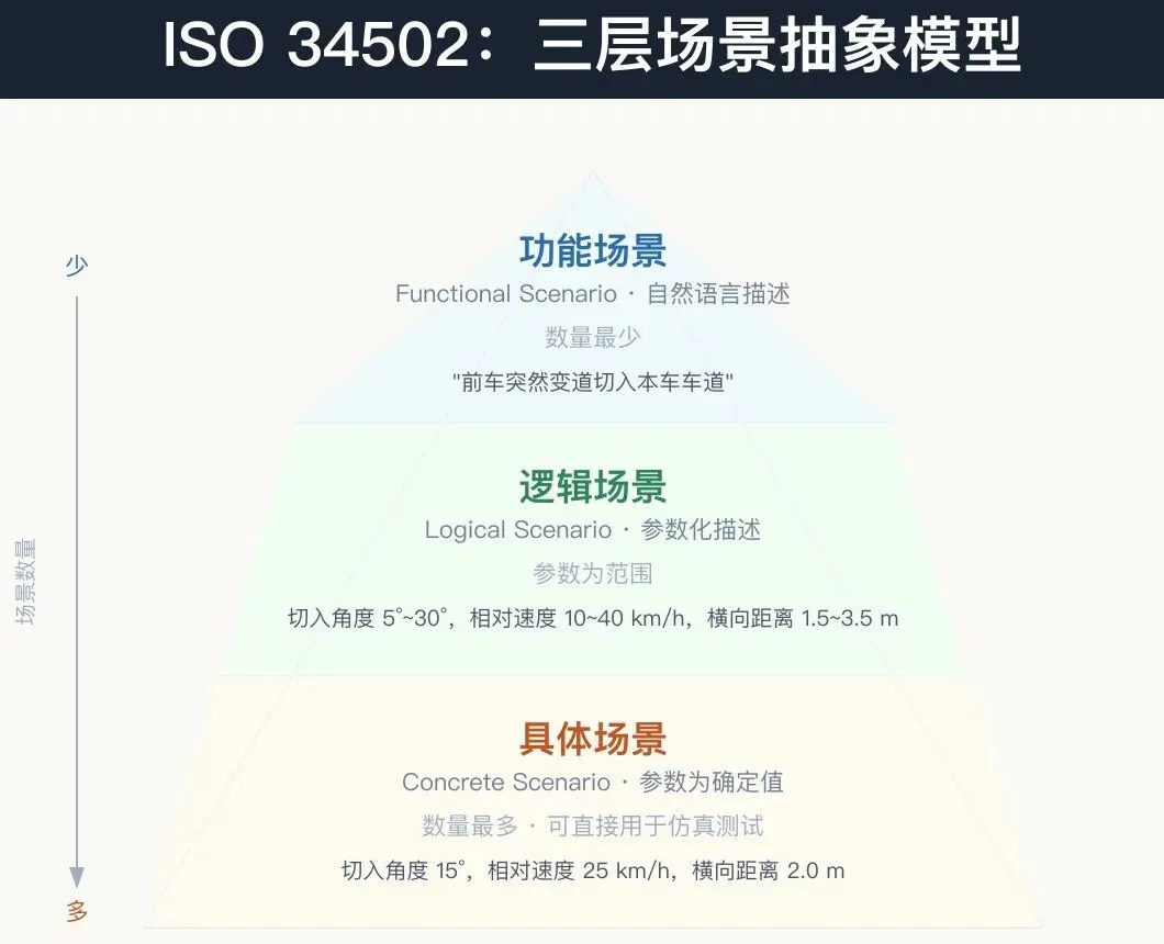 这个三层模型的价值在于:它把"无穷多的驾驶情况"转化为"有限且可管理的场景空间" 。功能场景用于专家讨论,逻辑场景用于参数化测试设计,具体场景用于可复现的仿真测试。