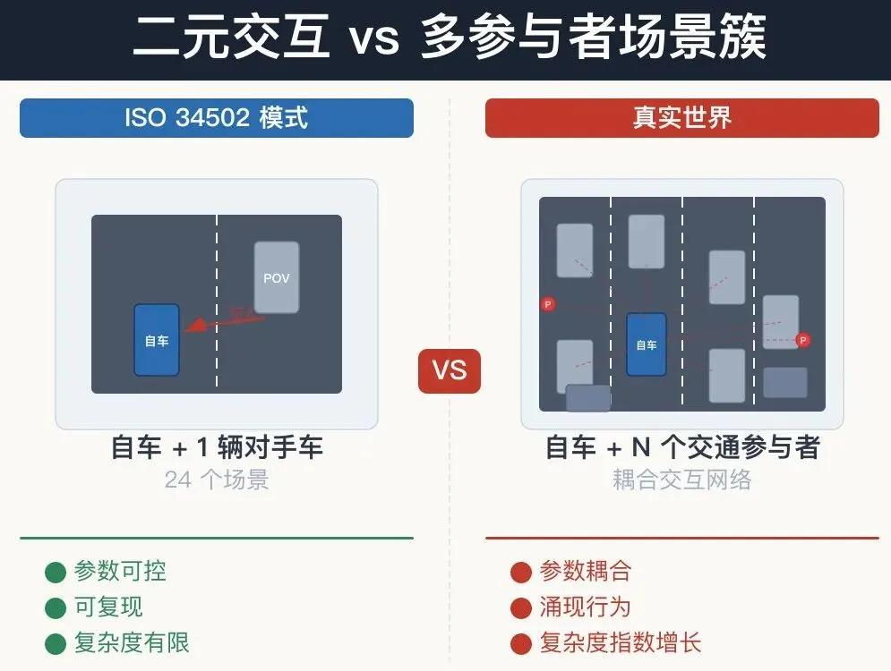 ISO 34502定义的24个高速场景,核心模式是 "自车 + 一辆对手车"的二元交互 。即使加上Cut-out场景中的"被遮挡目标",也最多是三元交互。