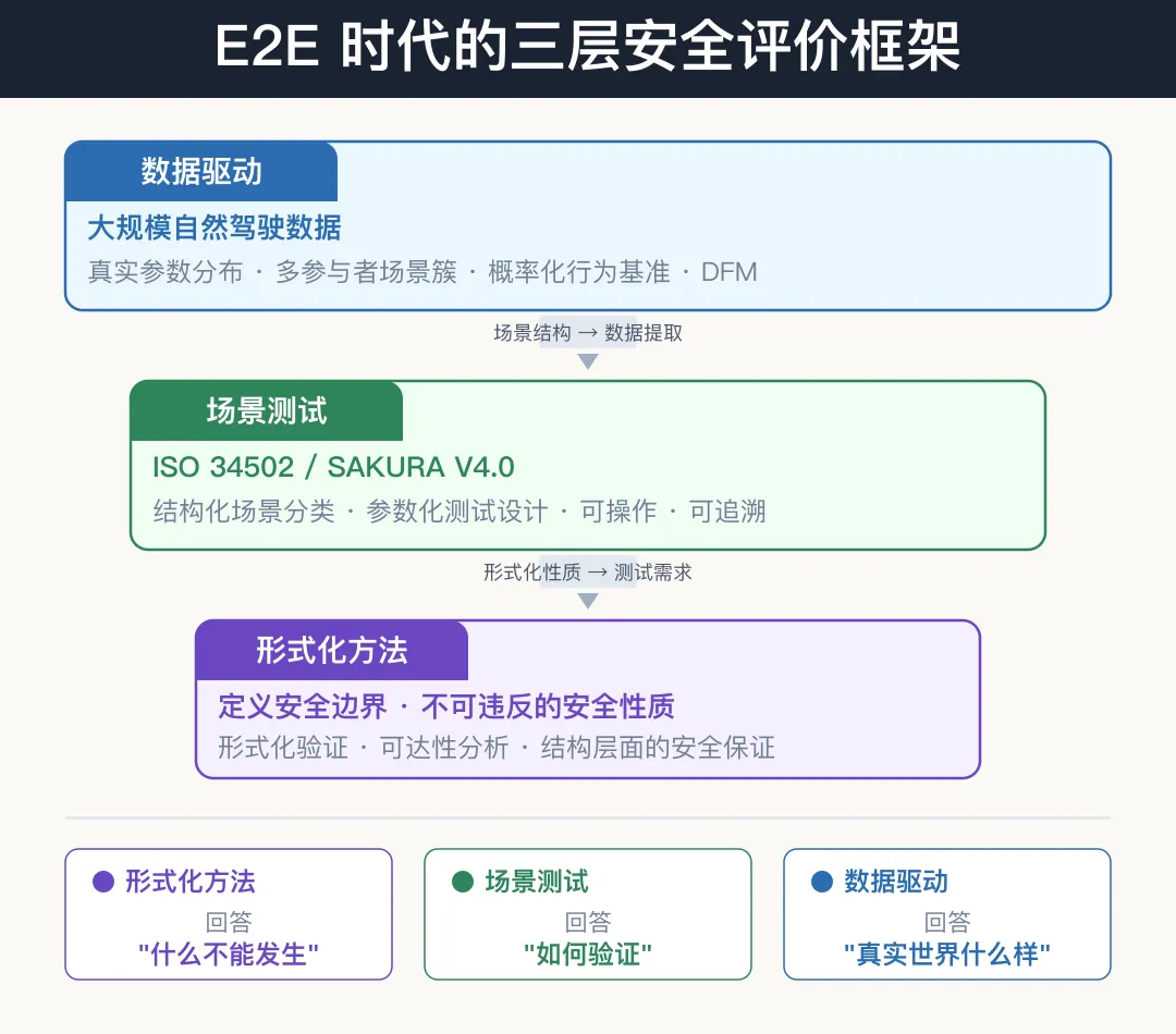 三层各有所长、各有所限。场景方法提供可操作的测试框架,数据方法提供真实世界的统计基准,形式化方法提供结构性的安全保证。