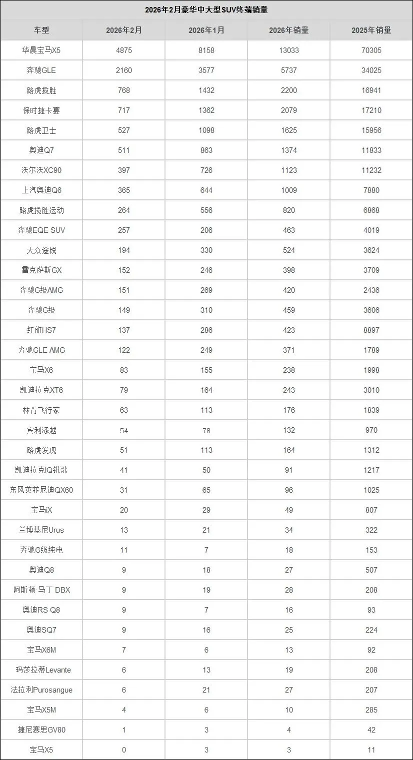 保时捷卡宴的2月终端销量为717辆,前2个月总销量2079辆,相比巅峰时期下滑明显,它需要换代车型来提升销量。奥迪Q7的2月终端销量为511辆,前2个月总销量1374辆;如果不是非常在乎品牌形象,Q7的性价比其实要优于国产宝马X5。大众途锐今年前2个月总销量524辆,它是进口大众体系最后的独苗,但也进入停产退市倒计时。