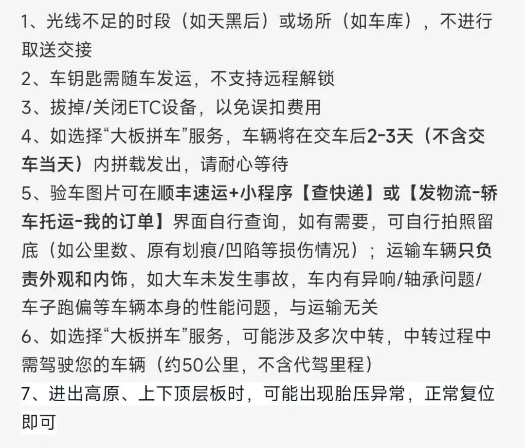 记者注意到,顺丰在车主注意事项中提及,光线不足的时段(如天黑后)或场所(如车库),不进行取送交接。所托运车辆拔掉/关闭ETC设备,以免误扣费用。海南进出岛涉及400-600元上船费,发往东北方向的车辆,务必提前更换防冻液等。