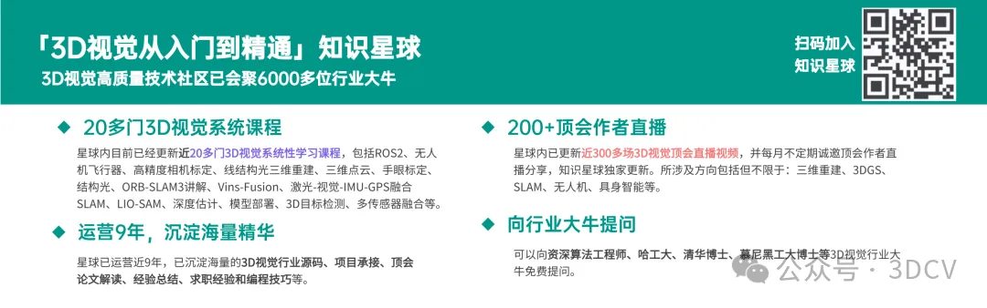 「3D视觉从入门到精通」知识星球(点开有惊喜) !星球内有20多门3D视觉系统课程、300+场顶会讲解、顶会论文最新解读、海量3D视觉行业源码、项目承接、求职招聘等。想要入门3D视觉、做项目、搞科研,欢迎加入!