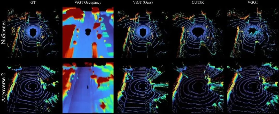 准确、具备度量意义的几何感知模型是实现可靠安全自动驾驶的关键。从图像及其他传感器模态中学习三维感知的几何表示,已成为自动驾驶和通用场景理解领域发展的核心。多视图重建领域的最新进展催生了一类新型端到端几何模型,它们能够直接从无标定的图像集合中估计稠密的三维点云图,并隐式恢复相机参数。尽管这些方法在通用领域的单目及多视图重建任务上表现出色,但其在自动驾驶场景中的应用仍面临挑战。首先,自动驾驶车辆常用的环视相机系统通常优先保证360度全覆盖而冗余有限,导致相机视图间重叠区域减少,从而削弱了这些方法所依赖的多视图几何假设。其次,许多近期出现的多视图重建模型未明确强制准确的度量尺度,而这对于自动驾驶应用至关重要。再者,逐像素的深度和点云预测通常与单张图像对齐而非全局场景对齐,导致难以协调多视角间的不一致性。相比之下,离散化的三维体素表示因能明确编码占据空间与自由空间,且与碰撞检测、运动规划等下游任务直接兼容,已在现代自动驾驶系统中被广泛采用。然而,基于体素的方法常面临可扩展性挑战,因其训练通常需要稠密且成本高昂的真值标注。