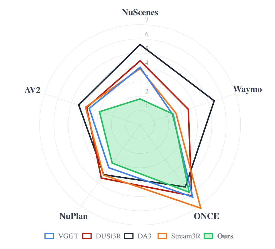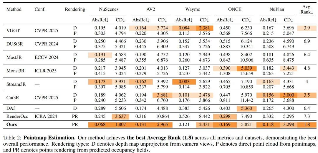 如表2所示,我们的方法在所有指标和数据集上取得了最佳的平均排名。图12对平均排名前三的方法进行了可视化对比。在NuScenes和Argoverse 2数据集上,我们在AbsRel和CD指标上均优于所有竞争方法。在NuScenes数据集上,我们取得了0.068的AbsRel和1.807的CD,相比第二名方法分别提升了0.105和1.83。在Argoverse 2数据集上,我们取得了0.131的AbsRel,优于最佳竞争对手0.031;并取得了2.965的CD,优于最佳竞争对手0.716。在Waymo数据集上,我们取得了第二佳的CD性能,仅落后最佳方法0.05。在ONCE和NuPlan数据集上,我们取得了最佳的AbsRel性能,CD性能分别位列第三和第二。