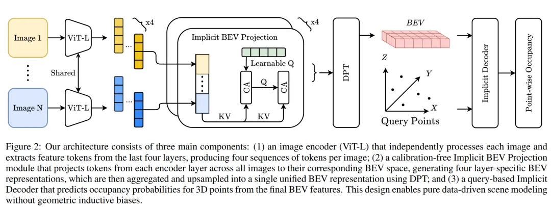 我们通过设计模型架构,优先考虑可扩展性、简洁性及对不同传感器配置的泛化能力,朝着构建通用的自动驾驶基础几何模型迈进。我们的架构包含三个主要组件(图2):独立处理每张图像的编码器;无需标定的隐式相机到鸟瞰图投影模块,其将独立的图像特征统一到以场景为中心的鸟瞰图表示中;以及基于查询的隐式解码器,用于预测三维点的占据值。