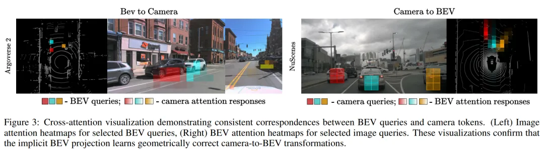 隐式鸟瞰图投影:自动驾驶应用需要在一个统一坐标系下、以度量尺度定义的、以场景为中心的几何表示。与深度图或点云图等图像对齐的表示不同,以场景为中心的表示支持对空间占据的直接推理,这对自动驾驶任务至关重要。为此,我们采用鸟瞰图表示,因为它能提供全面的场景覆盖,同时在计算和内存效率上优于稠密的三维体素网格。现有的自动驾驶方法依赖已知的相机内外参数,将图像特征显式投影到鸟瞰图空间。在简洁性和可扩展性原则指导下,我们寻求一种无需标定的、可将多视图视觉特征转换到鸟瞰图空间的方法,并适用于不同的相机配置。