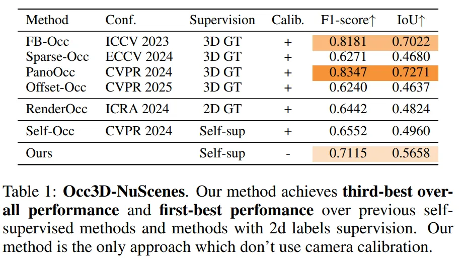 我们在不进行体素微调的情况下评估模型,以证明我们学习到的表示能够泛化到新的几何任务。我们的模型取得了综合性能第三名的成绩,F1分数为0.7115,IoU为0.5658,并且是唯一同时实现完全自监督和无需标定的方法。与需要昂贵三维标注的PanoOcc和FB-Occ等表现最佳的方法不同,我们的方法仅使用原始激光雷达点云进行监督,无需昂贵的人工标注。与此前最佳的自监督方法相比,我们在F1分数上提升了0.056,IoU上提升了0.07,同时还去除了对标定的需求。