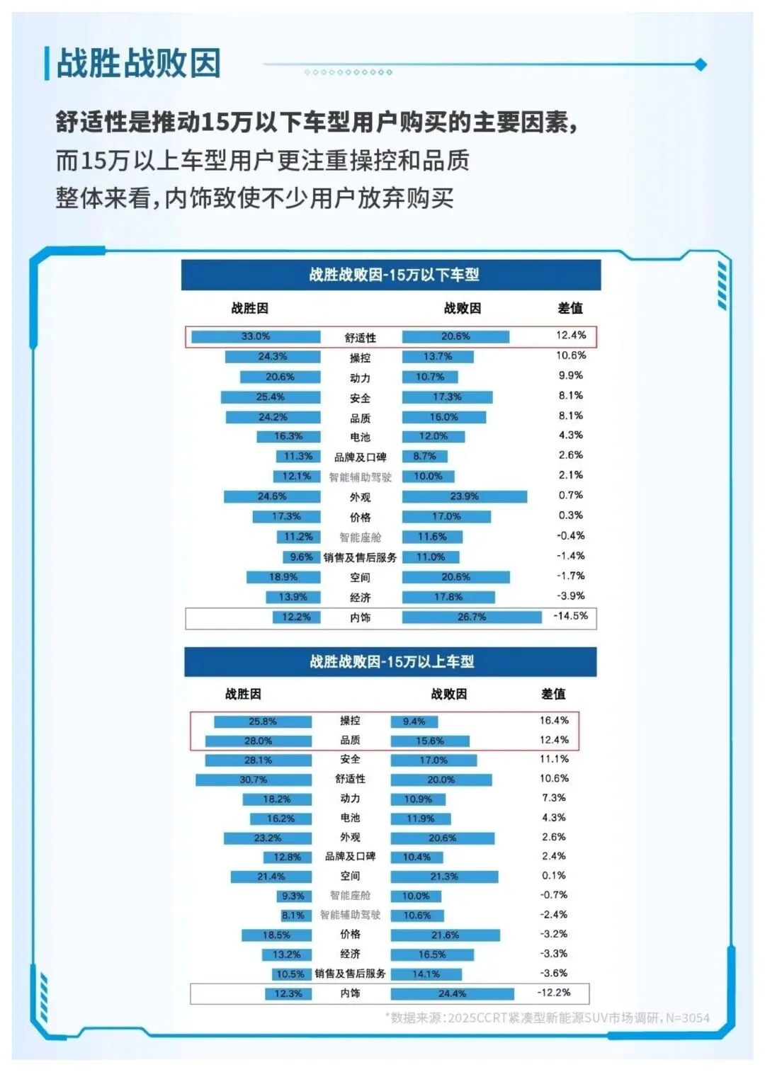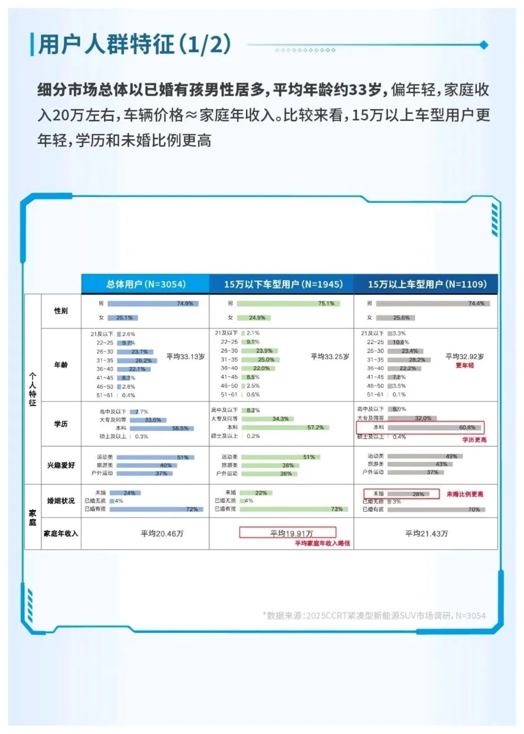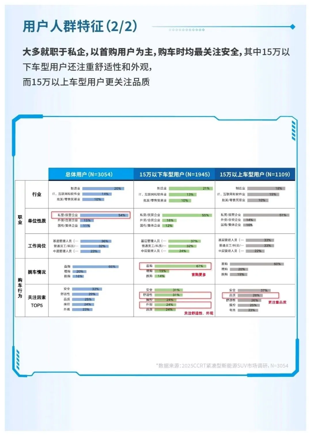 核心用户以33岁左右已婚有孩男性为主,家庭年收入约20万,首购用户占比65%。安全是所有用户购车的首要考量,15万以下车型用户更看重舒适性与外观,15万以上用户则聚焦操控与品质,内饰表现是用户放弃购车的最核心因素。