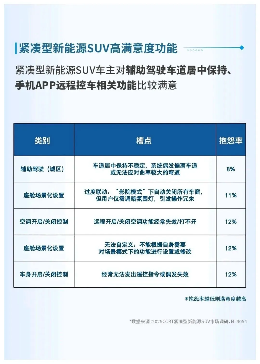 用户需求呈现明显的实用化特征,手机无线充电、主动降噪等基础座舱功能需求最强,全速自适应巡航、车道保持等基础L2智驾功能接受度高,对高阶城市领航、记忆泊车等功能需求较弱。当前用户最大的痛点集中在高温、高速场景下的续航衰减,以及语音交互方言识别能力不足。