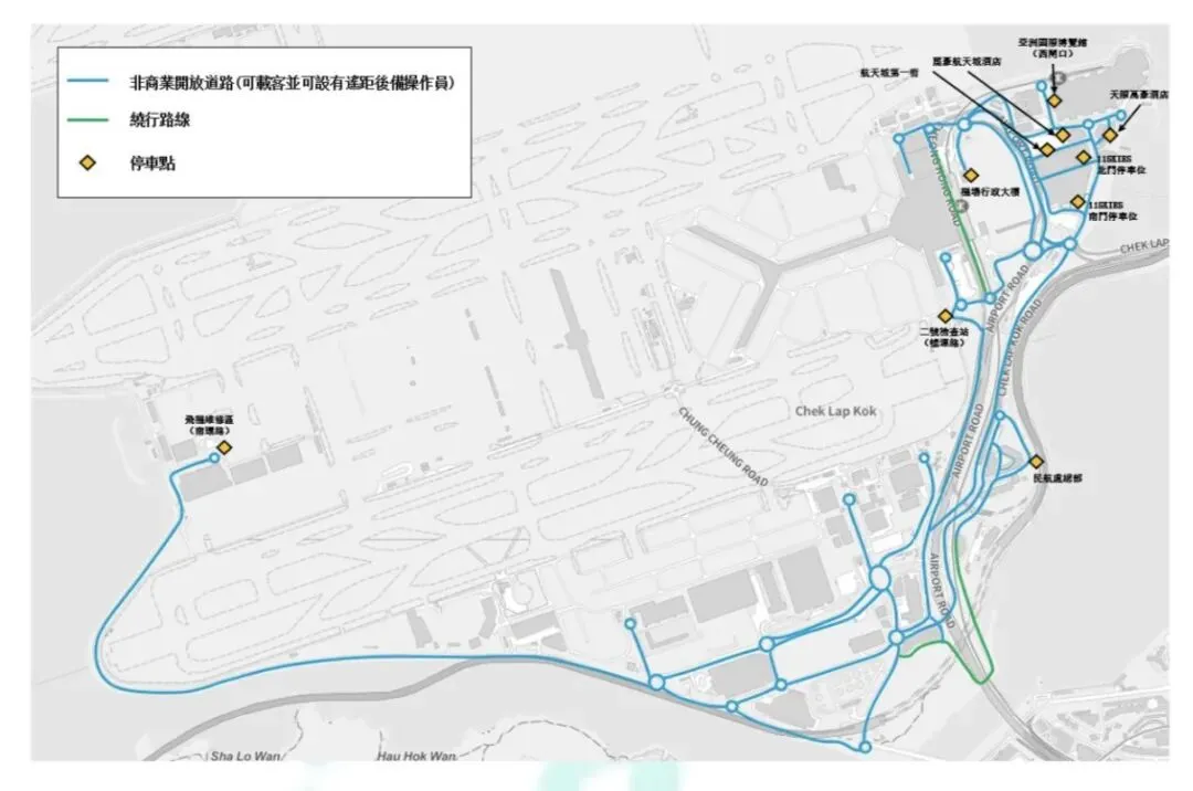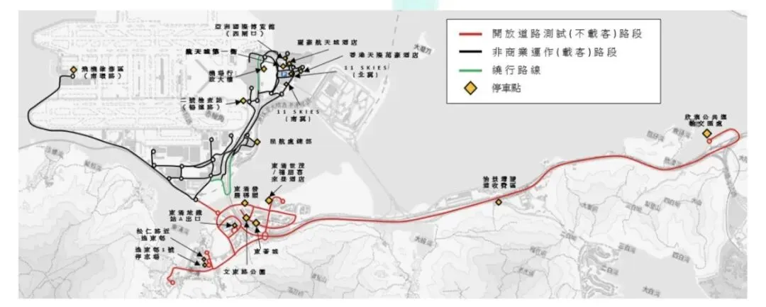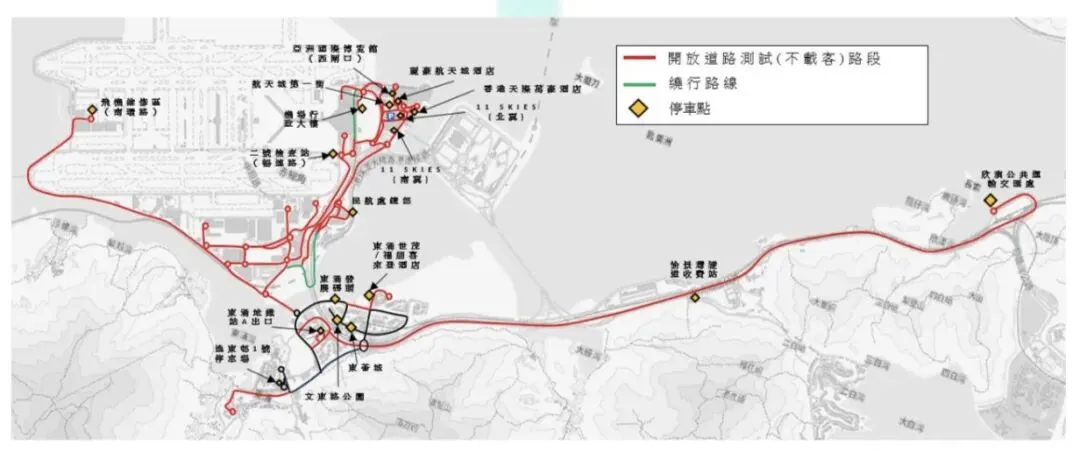 1. 机场岛路线的非商业开放道路运作(可载客),只可于01:00-05:00及08:00-22:00于下图中的测试范围/路线上手动或自动模式操作或进行测试。