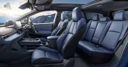 驾驶舱保持对Solterra一脉相承的风格,以< strong>7英寸仪表+14英寸悬浮式中控屏构成核心交互体系,支持Apple CarPlay与Android Auto全功能连接。中央鞍座保留电子旋钮档把、无钥匙启动以及双无线充电板,兼顾实用与美观。车门饰板、座椅等区域采用蓝黑撞色搭配,辅以皮质缝线处理,整车质感明显拉高,高配车型还可解锁天窗、脚踢尾门等功能。