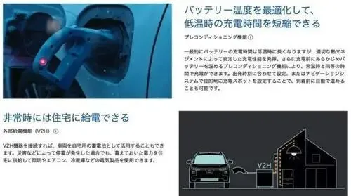 按照日本国土交通省测试标准,前置电机车型最高可达< strong>734公里续航,四驱版本也维持在690公里以上,表现稳居合资电动车梯队前列。得益于先进电池温控系统,仅需28分钟即可完成10%至80%充电。此外,该车支持< strong>V2H(Vehicle-to-Home)功能,突发停电时可为家庭临时供电,尤其对山地或偏远地区用户极为实用。