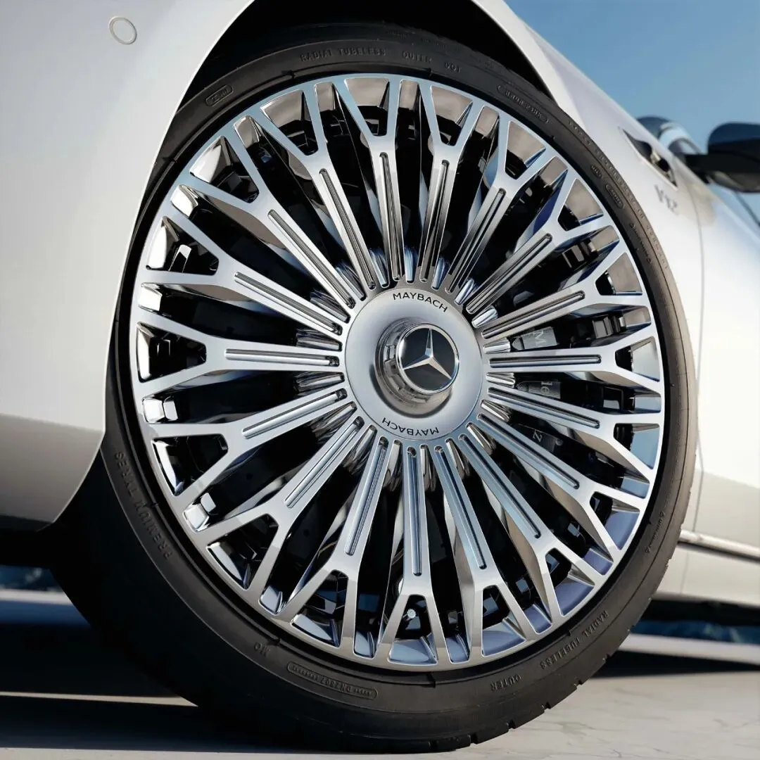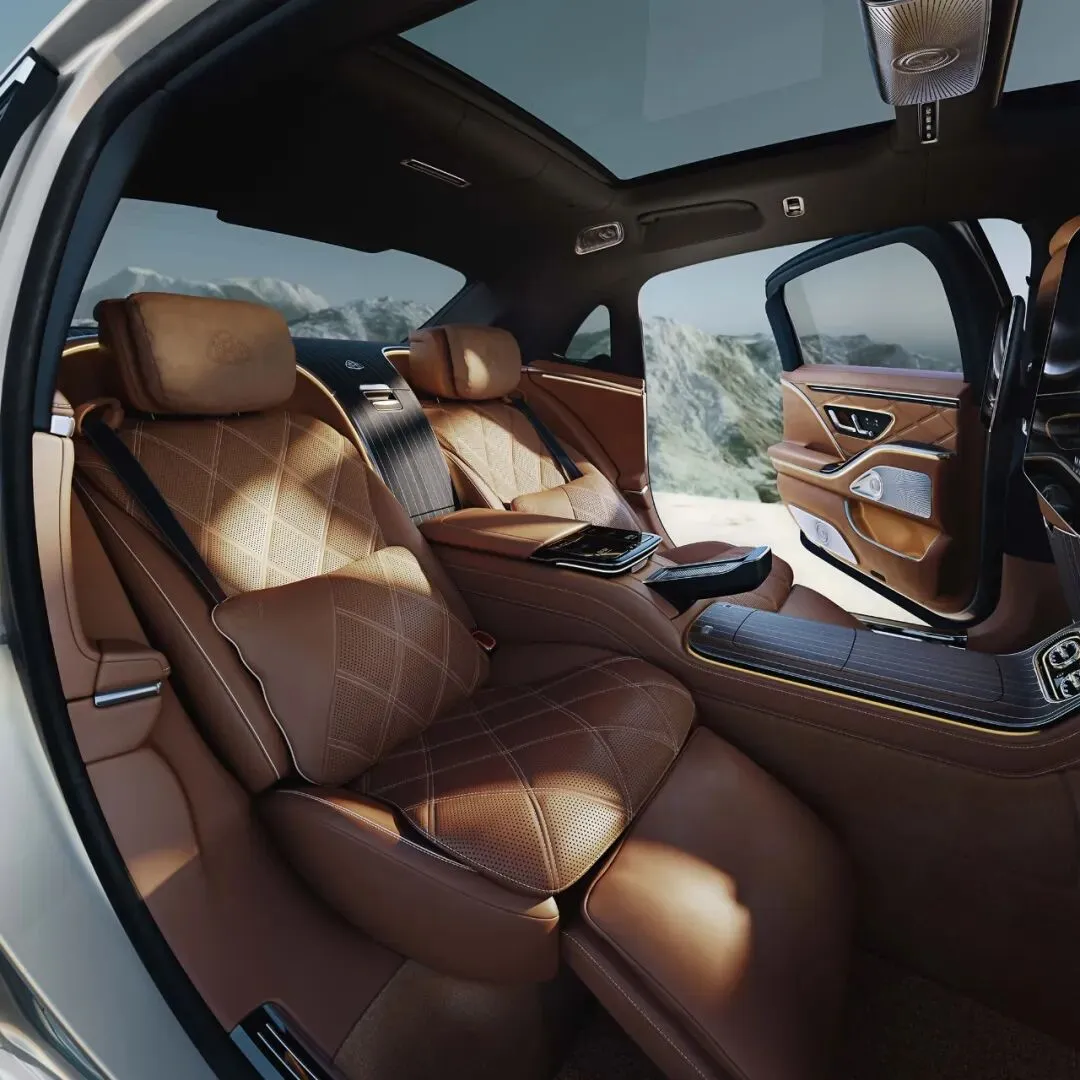 车侧迎宾踏板集成投影装置,在迎宾与送别时刻,将“MAYBACH”字样投映于地面,为出行注入更多礼遇。分段式尾灯内嵌3枚星徽饰件,与前大灯遥相呼应,无论昼夜皆散发迷人光彩。全新设计的尾翼双色饰条,以镀铬与亮黑色分段呈现,于方寸之间展现迈巴赫“即使细节亦可品鉴”的至臻理念。新增全新20英寸多辐锻造轮毂与21英寸金色MANUFAKTUR定制轮毂;所有银色锻造轮毂中心饰以悬浮式三叉星徽,凭借精密的滚珠轴承结构,无论车轮如何转动,星徽始终昂然正立,彰显顶级豪华与生俱来的从容优雅。可配备的后排舒适车门可通过车顶按键或后排显示屏轻触操作,车门自动轻柔开合;后排乘客无需屈身手动,即可优雅进出,举手投足间尽显迈巴赫独有的从容与尊贵体验。
