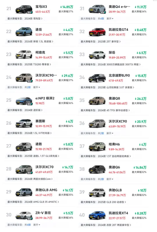 当下的SUV市场,新能源车和燃油车之间的销量争夺越发激烈,市场格局也正在迎来重塑,特别是在临近春节购车需求增加的关键节点下,SUV市场再次迎来了大降价,多达53款车型降幅超30%,榜单前3甲新车售价出现“腰斩”,而豪华车则成为降价榜的“重灾区”,包揽了榜单前10名。奔驰通过大幅的降价锁定了榜单前3名,揽胜极光、英菲尼迪QX50、捷豹E-PACE等二线豪车降幅巨大,排名均位居前列,主流合资品牌在市场竞争的压力下,也不得不更进降价,途岳、探岳排名靠前,哈弗H6、锋兰达等热销车型降幅均超30%,沃尔沃XC60、奥迪Q5L也都跻身榜单前50名。太难了!2026年SUV价格“大跳水”,最高降幅50%,豪华车跌成“白菜价”首先,榜单前14名最大降幅超40%,其中,奔驰成为降价榜的领军者,奔驰EQB、奔驰EQA、奔驰GLA包揽前3,最大降幅均大50%,奔驰EQE SUV也跻身前5,路虎紧随其后,极光揽胜、发现运动降幅君超45%,宝马iX和宝马iX1也都稳居榜单前10名,元Pro成为唯一入榜前20名的国产车,终端让利最高4万,此外,沃尔沃、凯迪拉克亦有多款车型降幅在38%以上,优惠惊人。榜单第21-40名中合资车占据了其中的18款,途岳、柯珞克等德系车型降幅达37%,赛图斯、途胜终端让利均在4万以上,上市不久的沃尔沃XC70以14.7万的优惠位居榜单第27,ZR-V致在、探岳最大降幅超33%,国产车中,北京越野BJ90优惠高达15.8万元,哈弗H6则作为主流车型之姿跻身榜单前40名。榜单最后,销量爆降的奇骏其实优惠力度并不低,最新优惠达5.8万,入门级车型已降至10万出头,探歌、奥迪Q3、锋兰达降幅也都在30%以上,作为热销车型,这样的优惠力度也非常大了,奥迪Q5L跻身榜单前50名,终端优惠超10万元,奔驰GLC、昂科威S、捷达VS5也纷纷上榜,最大降幅都在29%以上,价格也很优惠。