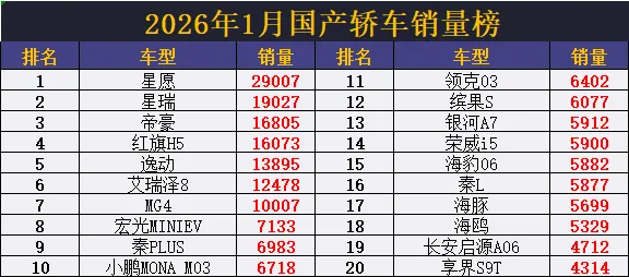 2026年1月国产轿车市场迎来剧烈震荡,在国补、购置税等不利政策的影响下,以新能源车为主的国产轿车市场突然出现“水土不服”,销量榜排名出现大变化,多款热销的主流新能源轿车销量出现暴跌,而燃油车则迎来了大爆发,国产轿车市场的竞争变得越发激烈。据2026年1月国产轿车销量榜显示,仅有7款车型销量破万,其中新能源车只占据了其中的两款,燃油车首次实现反超。在SUV市场表现出色的吉利品牌,在轿车市场销量则更为惊艳,包揽了榜单前3名,星愿稳居榜首,星瑞、帝豪紧随其后,红旗H5也高居榜单第4,逸动、艾瑞泽8销量均超绝大部分新能源车型。比亚迪销量突然哑火,秦PLUS勉强跻身前10,秦L、海豹06销量均不足6000辆,此外值得注意的是小米SU7本月排名以已跌出前50名,月销只有千辆出头。先来看看榜单前20名,星愿销量超2.9万辆,虽然受到购置税和国补等不利政策的影响,但星愿依旧有着稳定输出,值得肯定。星瑞以1.9万辆的销量紧随其后,帝豪、红旗H5都1.6万多辆,MG4月销依旧破万,表现超过了极狐T1、海鸥的竞品车型,秦PLUS不足7000辆实属一般,银河A7、荣威i5都5000多辆,海鸥仅售5329辆,来到了历史销量的最低点,反倒是享界S9T则成功跻身前20名,逐步受到市场青睐。在榜单第21-50名中,多款经典车型销量不及预期,银河星耀8售出3817辆,极氪001以跌破3000辆,五菱缤果,海豹05DM-i一月仅售出2000多辆,比亚迪汉更是险些跌出前40名,反观百万级旗舰豪车尊界S800却依旧有着出色的销量,本月售出2798辆新车,成功闯入榜单前30名。榜单最后,从第51-100中,销量破千的只有9款车型,没有了国补的加持,奔腾小马仅交付1239辆新车,长安Lumin更是跌至第55名,要知道此前可是轻松破2万辆的存在。小米SU7由于改款清库只卖了1133辆,阿维塔06、小鹏P7都不足千辆,汉L位列第70名,而蔚来ET5、零跑T03等新势力车型销量已来到500辆以下,高歌猛进的时代已彻底不再。