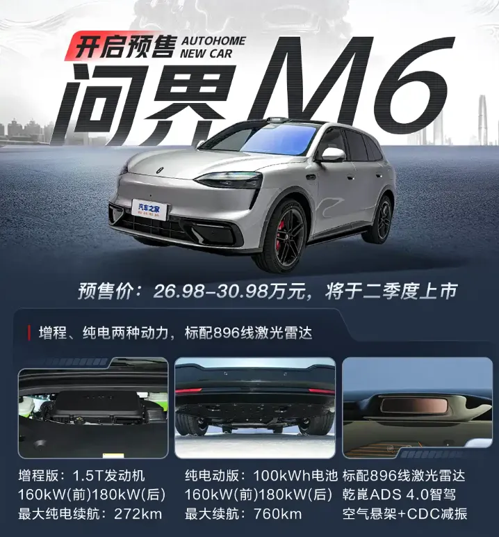 问界M6开启预订,预售价26.98-30.98万元。这个价格直接卡位特斯拉Model Y和理想L6之间,摆明了要抢年轻家庭的市场。