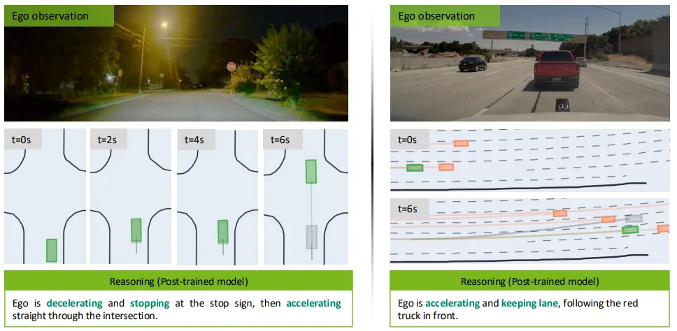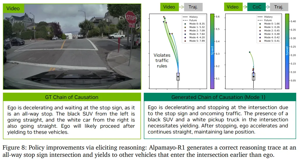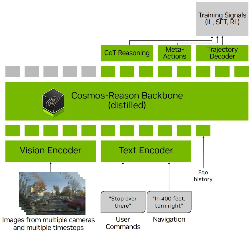 NVIDIA的解法是:让模型在规划轨迹之前,先用自然语言把驾驶决策的因果链写出来。这不是在给模型"加注释",而是把推理本身变成控制信号的一部分。
