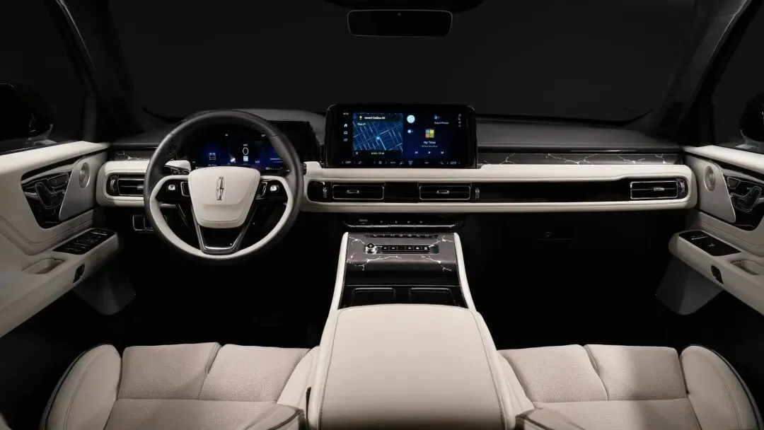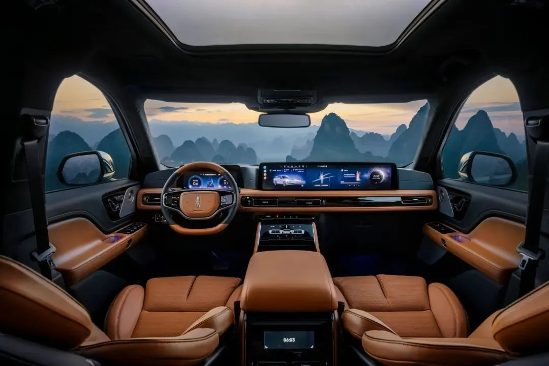 然.后进.到车里。来,我现在.拉开.车门,坐进.来。第一感.觉.就.是,安静。真.的.安静。关门.那.一下“咚”,很厚.实。中控台这.块,我用手摸一下,皮.质.覆盖面积挺大,用指甲敲一下,也不是那种空.的。木.纹饰板是那.种偏深.色的,美.式味儿很浓。屏幕尺寸不.算夸张,但清晰.度够.用。就.是有个小槽.点,这个UI逻辑,说实话不算聪明,用着用着.你得.适应一下。座椅真的.要夸一.句,宽大、软,但是不塌,长途特别.友好。