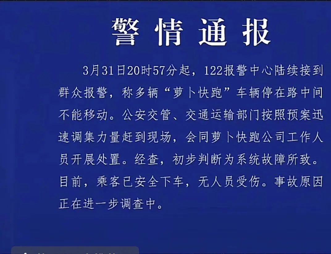 3月31日晚,武汉街头一段“无人驾驶汽车集体停在马路中间”的视频火速冲上热搜。画面里,多辆自动驾驶车辆突然失去响应,直直僵在车道中央,后方车辆纷纷急刹避让,现场一度混乱拥堵。网友直呼吓人:“AI也会集体罢工?”“这要是在高速上,后果不敢想!”