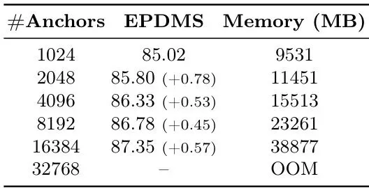 他们做了个非常扎实的缩放研究,选了个代表性的打分法Hydra-MDP,然后不断增加它静态词汇库里轨迹锚点(Anchors)的数量。结果出人意料又合情合理:如上表所示,性能(EPDMS)随着词汇库变密而持续提升,在算力撑不住之前(32768个锚点时内存溢出OOM),完全没有饱和的迹象!