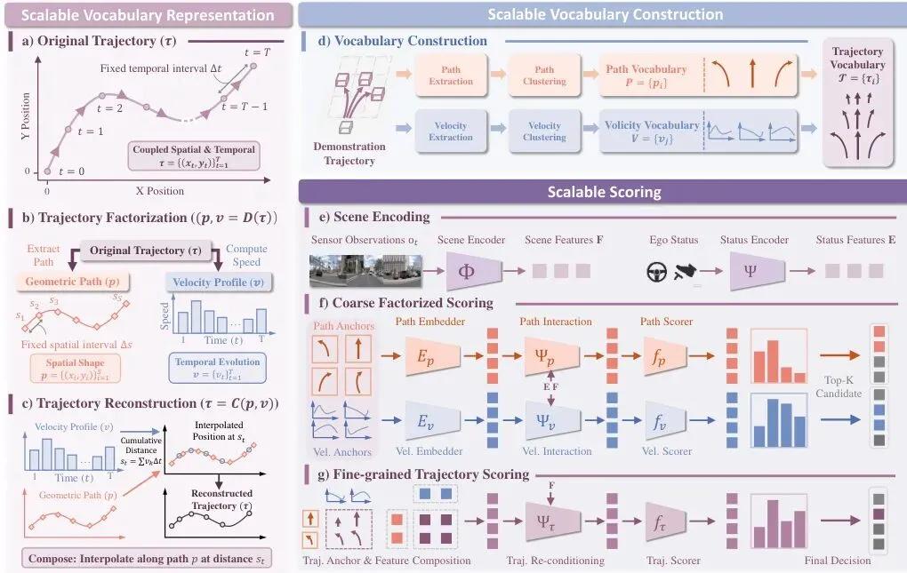 图1:SparseDriveV2框架概览。SparseDriveV2将 (a) 一条时空轨迹分解为 (b) 一条几何路径和一个速度剖面,并通过 (c) 组合这两个分量来重建轨迹。这种表示使得 (d) 可以从一个紧凑的路径集和速度剖面集构造出一个超密集的轨迹词汇库。在 (e) 场景特征的条件下,可扩展的评分策略首先对路径和速度剖面进行 (f) 粗粒度的分解式评分以选择 Top-K 候选,然后对组合后的轨迹进行 (g) 细粒度评分以产生最终的规划决策。
