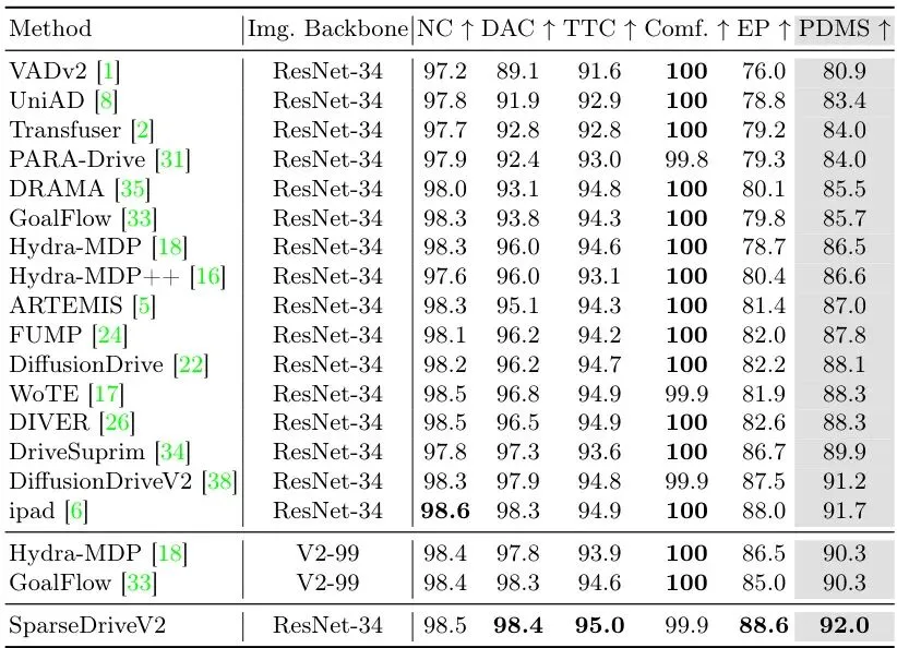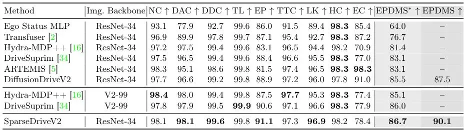 在指标更严格的NAVSIM v2上(见表3),SparseDriveV2(ResNet-34)的EPDMS达到了90.1,同样是使用ResNet-34方法中的第一名,并超过了使用V2-99主干的DriveSuprim(86.0)。